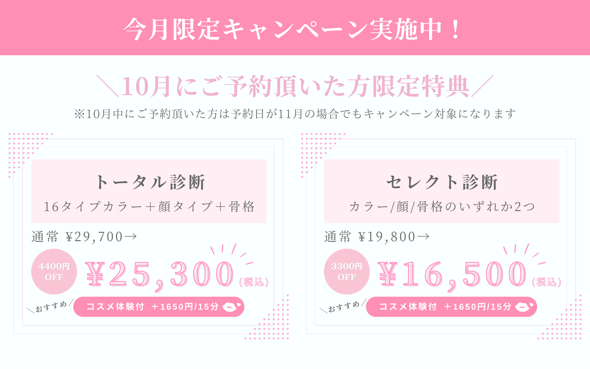 ※カラー診断or顔タイプのいずれかを受けられた方のみ予約可能(他サロン診断も可)