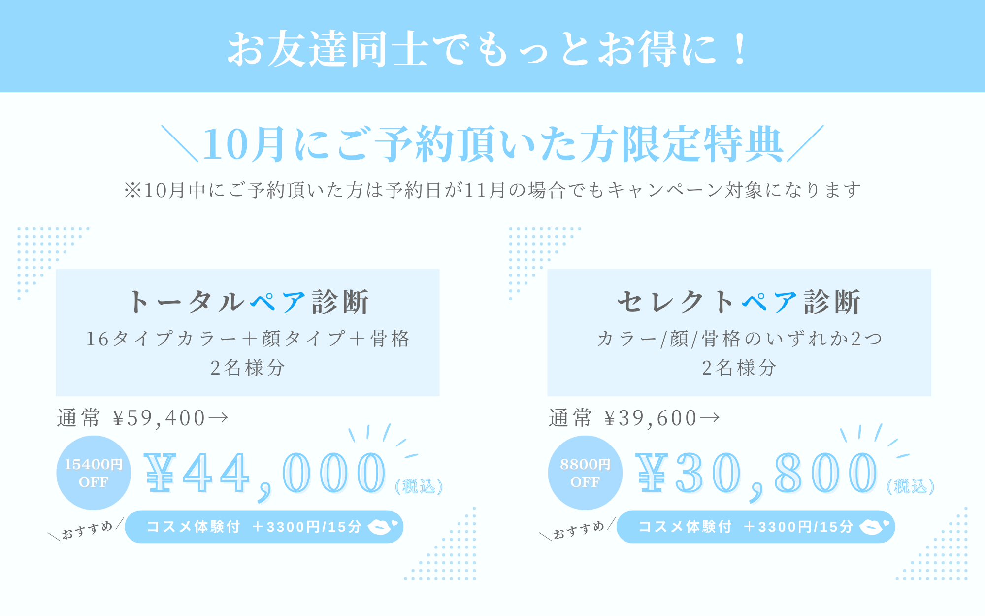 ご家族やお友達と一緒に受けられる♩2人でさらにお得に!